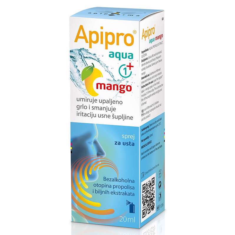 Apipro® Aqua Mango sprej za grlo je medicinski proizvod namijenjen za ublažavanje simptoma upale i nadražaja grla, za tretiranje afti i sl._x000D_