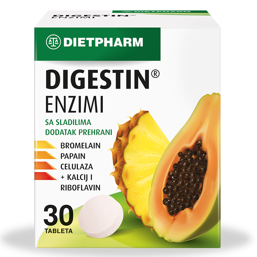 Za zdravu probavu – Digestin® enzimi! Digestin® dodatak prehrani s odabranim enzimima iz tropskih voćki ananasa i papaje (bromelainom i papainom), celulazom (pridonosi probavi topljivih i netopljivih vlakana), kalcijem i riboflavinom._x000D_