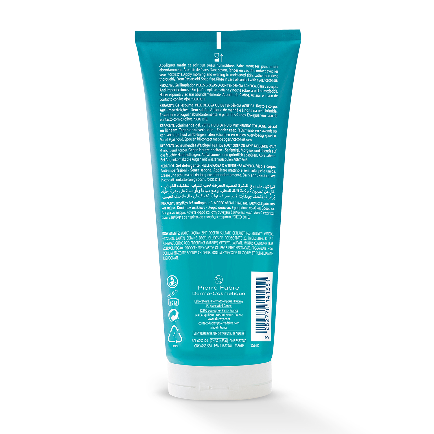 Keracnyl pjenušavi gel blago pročišćava i čisti kožu sklonu nastanku akne. Lice i tijelo. BEZ SAPUNA. Nekomedogeno. Ispitano pod nadzorom dermatologa. Podnošljivost ispitana u kombinaciji s anti-akne terapijom lijekovima. NEKOMEDOGENO. BIORAZGRADIVA FORMULA*._x000D_