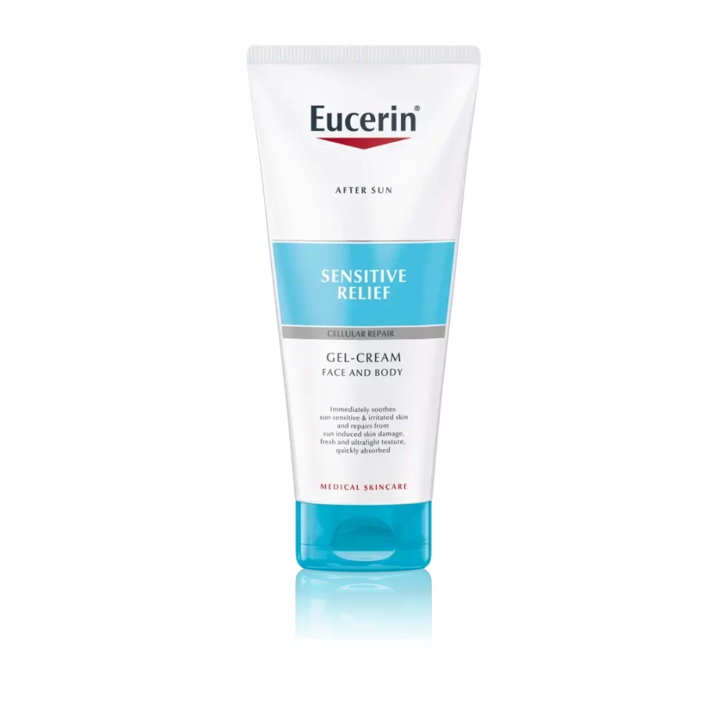 Eucerin umirujuća gel-krema nakon sunčanja je proizvod za njegu osjetljive kože i kože sklone alergiji na sunce. Umiruje i pomaže regenerirati kožu izloženu suncu._x000D_