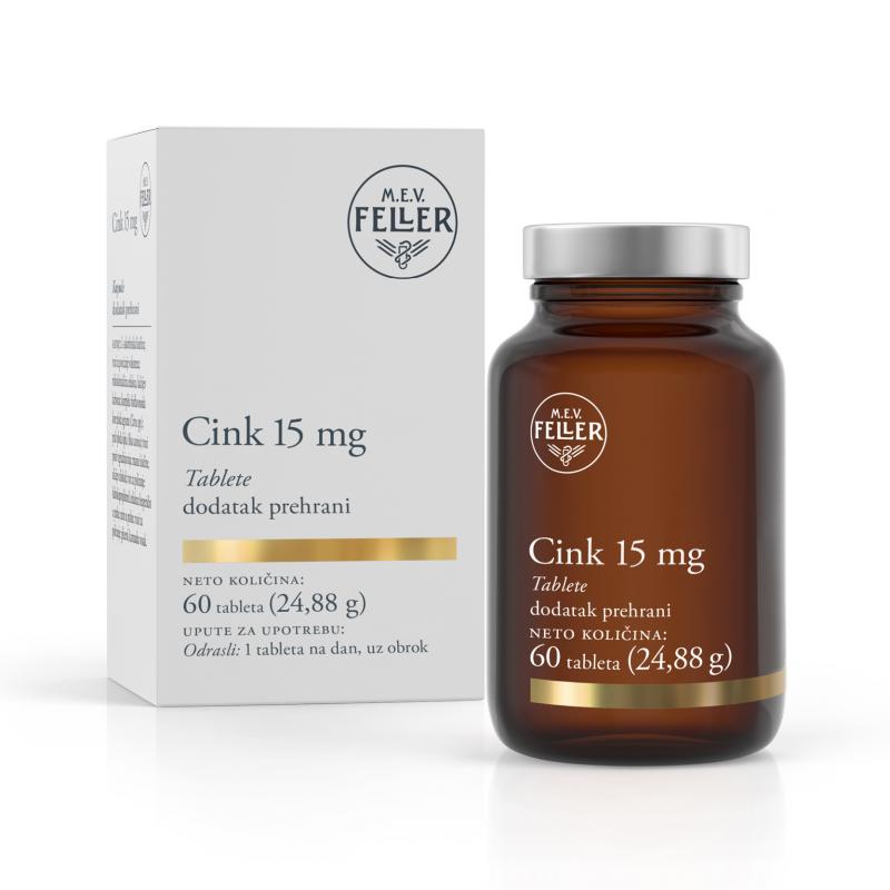 M.E.V. Feller® Cink 15 mg u preporučenoj dnevnoj dozi (1 kapsula) sadrži 15 mg cinka što je 150% preporučenog unosa za odrasle osobe._x000D_