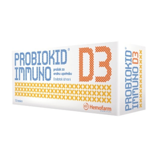 Dodatak ishrani u obliku praška za oralnu upotrebu koji sadrži probiotske bakterije, prebiotike fruktooligosaharide, i vitamin D3 u pakovanju od 10 kesica._x000D_